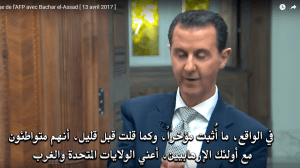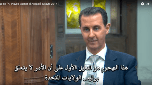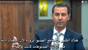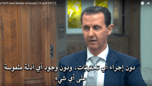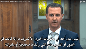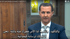 Lors d’un entretien accordé à un journaliste de l’AFP, le 13 avril 2017, le président Bachar Al Assad devait évoquer la présumée attaque chimique menée quelques jours auparavant, le 4 avril, sur le sol de son pays, à Khan Cheikhoun, et attribuée sans preuve à l’armée syrienne. [SANA, L’Agence Arabe Syrienne d’Informations, Le président al-Assad : « Nous ne possédons pas d’armes chimiques et nous avons renoncé à tout notre arsenal », 14 avril 2017. Note de l’Auteuse : Quelques termes modifiés ou ajoutés sont en écriture romaine (non italique) ; la ponctuation n’a guère été changée ; les indications entre crochets sont de mon fait. Et puis… ce qui est trop rare pour ne pas être signalé : le journaliste pose des questions claires, nettes et précises avec tout le sérieux possible, sans chercher à piéger son interlocuteur, et il écoute les réponses de celui-ci sans l’interrompre ; ce respect mutuel, tout au long de l’entretien, contribue à la qualité de celui-ci. Voici les premiers moments de ce qui est un véritable entretien.]