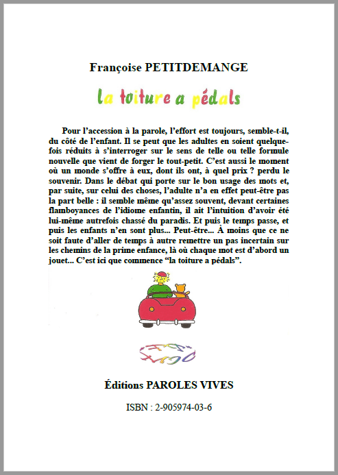 Après avoir écrit et publié, en 1981, le roman Le dernier chemin, dans lequel le personnage principal, une vieille dame, perd progressivement les mots qui lui permettaient jusqu’ici d’avoir une mémoire, cinq ans plus tard, en 1986, je commençais la rédaction d’un autre roman la toiture a pédals qui serait publié en 1993, dans lequel le personnage principal, un enfant, est occupé, quant à lui, à acquérir les mots qui lui permettent de construire son petit monde bien à lui qui va bientôt s’insérer dans un univers plus vaste. Les resituant dans leur contexte, je reprends, ici entre guillemets, quelques passages de ce livre :