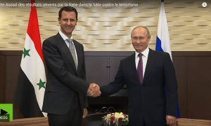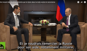 Bachar El Assad, qui sait ce que les États occidentalo-golfico-sionistes font vivre à la Syrie depuis six ans, lui répondait : « Merci beaucoup, monsieur le Président. Je suis très heureux de vous rencontrer à Sotchi deux ans et quelques semaines après le lancement par la Russie d’une très importante opération. Et je voudrais remercier la Russie pour son aide, notamment militaire, qui soutient l’armée syrienne dans la lutte contre le terrorisme. Sur cette période, de grands succès ont été atteints, sur le champ de bataille comme dans les champs politique et humanitaire. Avant tout, je voudrais profiter de cette opportunité et vous transmettre, monsieur le Président, les salutations et la gratitude du peuple syrien pour avoir défendu l’intégralité territoriale du pays et son indépendance. » [Idem.]