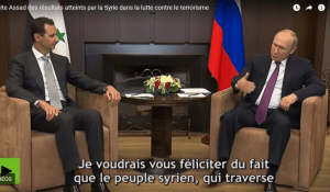 Vladimir Poutine, qui n’a pas oublié et qui ne peut oublier les tentatives de déstabilisation de la Russie par les États occidentaux, en passant par la Tchétchénie, durant toute la décennie 1990-2000, et par l’Ukraine, depuis 2014, s’adressait ainsi à Bachar El Assad : « D’abord, je voudrais vous féliciter des résultats que la Syrie a atteints dans la lutte contre les groupes terroristes. Je voudrais vous féliciter du fait que le peuple syrien, qui traverse de grandes difficultés, voit arriver, pas à pas, la défaite finale et imminente des terroristes. La question la plus importante est bien sûr celle du règlement politique pacifique à long terme, après la défaite des terroristes en Syrie. J’aimerais bien entendre vos estimations de la situation actuelle en Syrie et des perspectives de développement de la situation, y compris votre vision du processus politique. Nous pensons, bien sûr, qu’il doit se dérouler sous l’égide de l’ONU. » [RT (Russia Today), Vladimir Poutine a rencontré Bachar el-Assad Sotchi, 21 novembre 2017. Vidéo : Poutine félicite Assad des résultats atteints par la…]