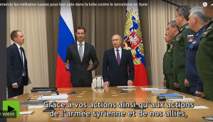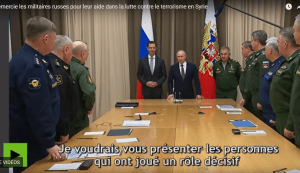 En présence de l’état-major de l’armée russe, le Président Poutine s’adressait tour à tour au Président El Assad et aux officiers : « Je voudrais vous présenter les personnes qui ont joué un rôle décisif dans la sauvegarde de la Syrie. [Aux officiers de l’armée russe :] Il [Bachar el Assad] connaît déjà, bien sûr, certains d’entre vous à titre personnel, mais pas tous. Cependant, il sait, comme il me l’a dit lors de nos dicussions, que, grâce aux efforts de l’armée russe, la Syrie a été sauvée en tant qu’État : tout a été fait pour stabiliser la situation en Syrie. J’espère que, dans un très proche avenir, nous atteindrons la phase finale dans la lutte contre le terrorisme. » [Idem. Vidéo : Assad remercie les militaires russes pour leur aide… Note FP : Les précisions entre crochets sont de mon fait.]