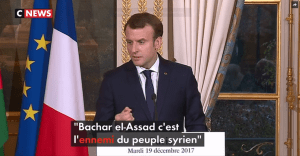 « Est-ce que Bachar El Assad est l’ami de la France ? Non ! Est-ce que Bachar El Assad est notre principal ennemi sur le terrain syrien ? Non, c’est Daesh. Bachar El Assad – je l’ai dit à plusieurs reprises – Bachar El Assad, c’est l’ennemi du peuple syrien. » [Cnews, Emmanuel Macron : Bachar el-Assad n’est pas l’ami de la France, 19 décembre 2017.]