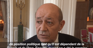 « M. Bachar el-Assad [ne] me semble pas vraiment en situation de pouvoir affirmer une prise de position politique tant qu’il est dépendant de la Russie et de l’Iran. Ensuite, quand on a été le premier à libérer les jihadistes de Daech [acronyme arabe de l’État islamique], on ne donne pas de leçons. Et enfin, quand on a passé son temps à massacrer son peuple, on a généralement un peu plus de discrétion. » [Vidéo, Le Parisien, Jean-Yves Le Drian répond aux accusations de Bachar al-Assad, 19 décembre 2017. Note FP : Le [ne] est de mon fait. Comme Macron, Le Drian paraît fâché avec les négations.]