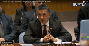 [ONU (Organisation des Nations Unies), Intervention du représentant permanent et ambassadeur de l’État plurinational de Bolivie à l’ONU, Sacho Sergio Llorentty Soliz. Samedi 14 avril 2018. Note FP : La transcription et les captures d’écran sont de mon fait. Remerciements à la personne qui a effectué la traduction simultanée de l’intervention. Vidéo RT (Russia Today, La Russie convoque une réunion d’urgence du Conseil de sécurité de l’ONU, 14 avril 2018.]