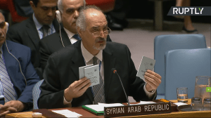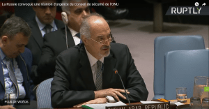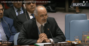 [ONU (Organisation des Nations Unies), Intervention du représentant permanent de la RAS (République Arabe Syrienne) à l’ONU, Bachar Al-Jaafari. Samedi 14 avril 2018. Note FP : La transcription et les captures d’écran sont de mon fait ; les précisions et les mots barrés et remplacés par d’autres, entre crochets, sont aussi de mon fait. Remerciements à la personne qui a effectué la traduction simultanée de l’intervention. Vidéo RT (Russia Today, La Russie convoque une réunion d’urgence du Conseil de sécurité de l’ONU, 14 avril 2018.]