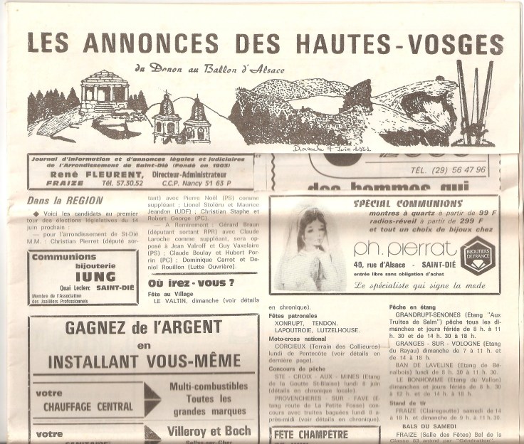 Notre première tribune a été constituée par cet hebdomadaire essentiellement distribué dans les familles de condition relativement modeste de la haute vallée de la Meurthe : Les Annonces des Hautes-Vosges. Pour en montrer la vraie nature, sans doute me suffira-t-il d’offrir ici une reproduction de la moitié supérieure de la première page. La voici…