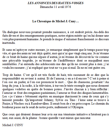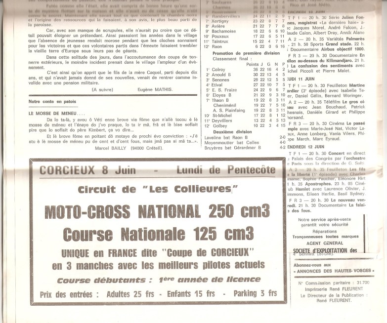 Le reste était à l’avenant, et s’achevait sur cette dernière demi-page… où l’on voit, au-dessus du placard annonçant le moto-cross de Corcieux, les cinq lignes du « conte en patois »…