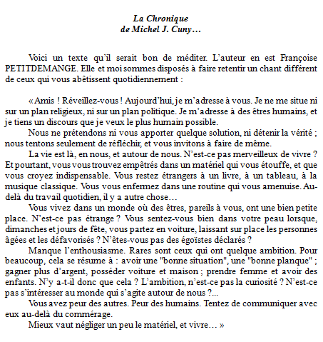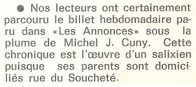 Apparue pour la première fois dans les Annonces des Hautes-Vosges le 11 avril 1976, La Chronique de Michel J. Cuny devait prendre de plus en plus d’ampleur, c’est-à-dire que, de semaine en semaine, les articles que nous adressions à son directeur, René Fleurent, gagnaient en volume… Qu’ils aient toujours été acceptés, et dans un format grandissant, était pour nous la preuve de ce que notre activité d’écriture ne choquait pas autant que nous aurions tout de même pu le craindre…