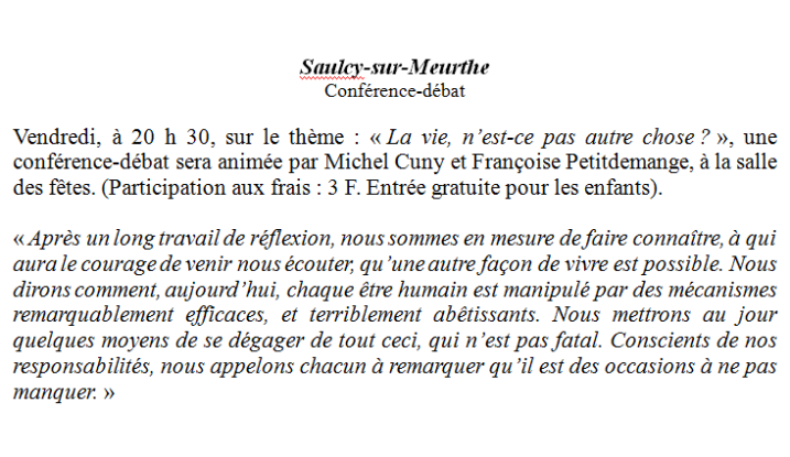 Ouvrons le journal lui-même : les noms des diverses localités concernées par telle ou telle information particulière apparaissent en plus gros caractères. Ainsi, dès le dimanche 25 avril, trouve-t-on un petit encart sous le panneau : Saulcy-sur-Meurthe. Nous n’y étions pour rien, Françoise Petitdemange et moi. D’où une joie certaine… Voici ce que nous avions pu y lire :