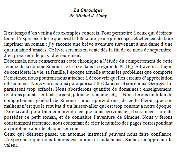 À compter du 26 septembre 1976, et, bien sûr, en accord avec le directeur de la publication, René Fleurent, qui aurait pu suspendre l’opération à l’occasion de tout nouveau numéro, la Chronique de Michel J. Cuny aura été accompagnée d’un bon de commande qui permettait, à qui le souhaitait, d’acquérir par courrier un exemplaire du roman Une femme très ordinaire contre la somme de 27 francs (port compris).