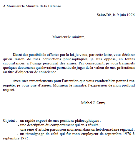 C’est ainsi que, le 9 juin 1976, au beau milieu des conférences que nous tentions de donner dans les quelques bourgades précédemment mentionnées, j’ai adressé cette lettre au ministre de la Défense, Yvon Bourges…