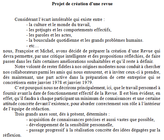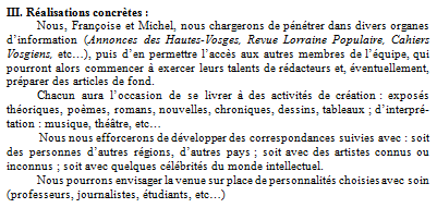 Or, bien assuré(e) que Les Annonces des Hautes-Vosges ne pourraient sans doute pas nous tolérer bien longtemps – même si, à ce moment-là, nous ne nourrissions encore aucune inquiétude à ce sujet -, mais surtout conscient(e) de la faible place que représentaient les quelques colonnes que nous y remplissions toujours davantage, Françoise Petitdemange et moi-même avons mis au point un plan de travail intitulé Projet de création d’une revue. Il porte la date du 13 janvier 1977. Le voici…