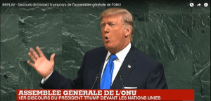 « L’heure est vraiment venue, pour les nations du monde, d’affronter un autre régime imprudent qui parle très clairement de destruction d’Israël, qui dit « mort à l’Amérique », qui parle de destruction et qui risque de mettre à mal de très nombreuses nations du monde. » [Assemblée Générale de l’ONU à New York, Discours de Donald Trump, 19 septembre 2017. Note de l’auteuse : La transcription du Discours est de moi. Mais la traduction est le fait d’une personne de l’ONU : qu’elle en soit ici remerciée.]