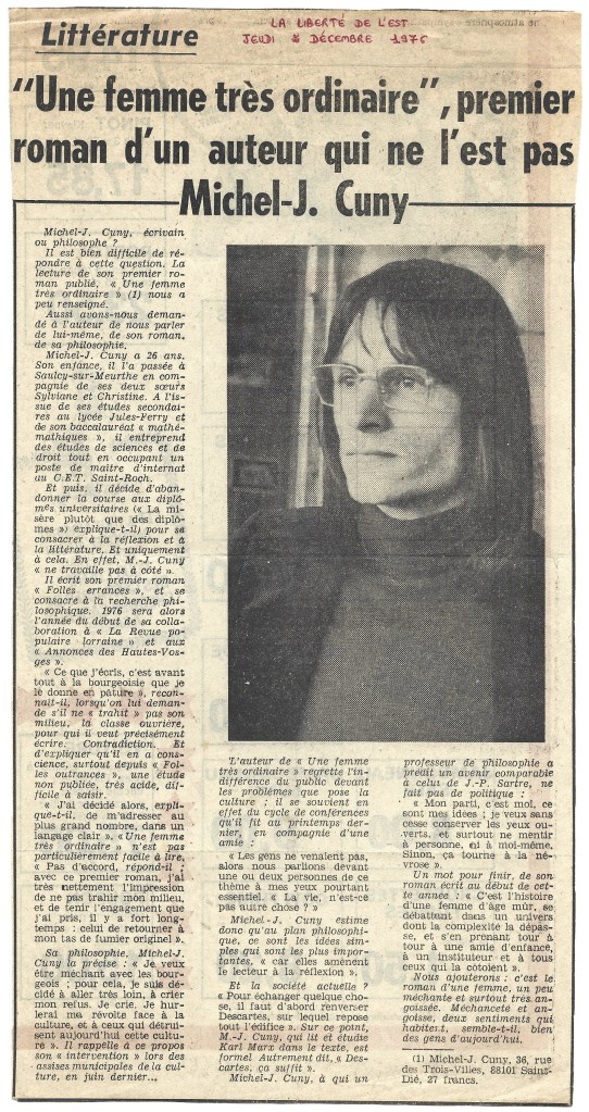 2. Littérature « Une femme très ordinaire », premier roman… Publié le 9 avril 202110 avril 2021 par Cuny Petitdemange La Liberté de L’Est, 88 Saint-Dié, Jeudi 2 Décembre 1976 3. Michel J. Cuny “Une femme très ordinaire” Ed… Partager : Partager sur X(ouvre dans une nouvelle fenêtre) X Partager sur Facebook(ouvre dans une nouvelle fenêtre) Facebook J’aime chargement…