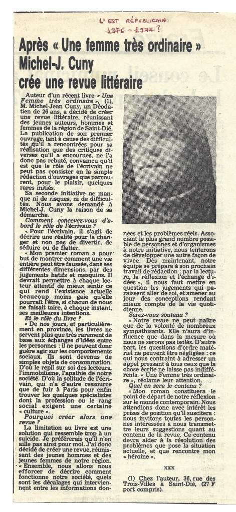 4. Après « Une femme très ordinaire » Michel-J. Cuny… Publié le 9 avril 202110 avril 2021 par Cuny Petitdemange L’Est Républicain, 88 Saint-Dié, 1976-1977 ? 5. En traversant le grand pont – La revue des revues Partager : Partager sur X(ouvre dans une nouvelle fenêtre) X Partager sur Facebook(ouvre dans une nouvelle fenêtre) Facebook J’aime chargement…