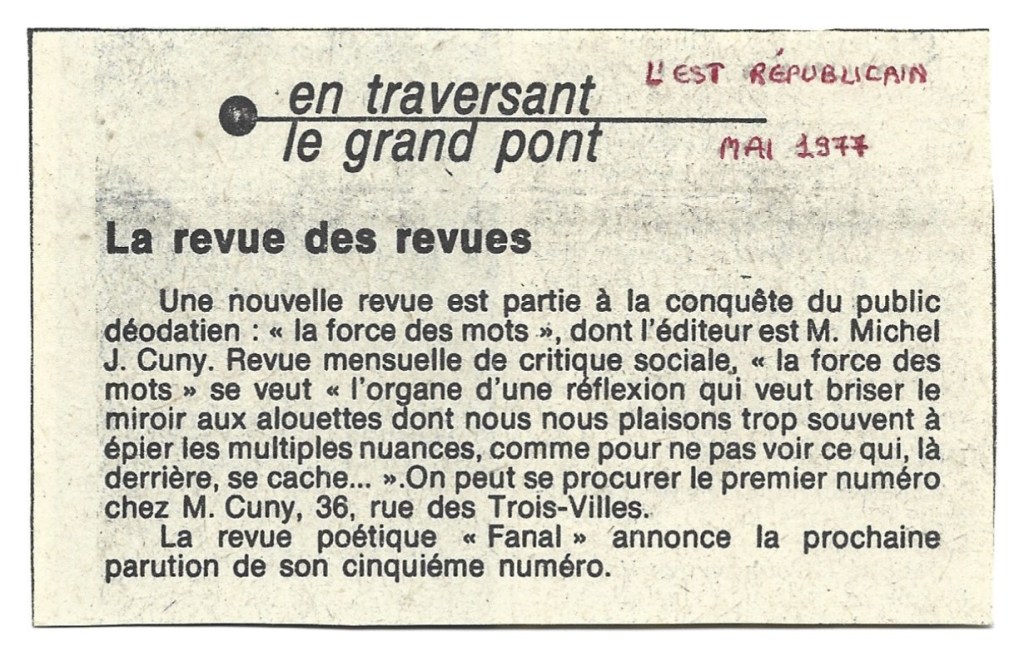 5. En traversant le grand pont – La revue des revues Publié le 9 avril 202110 avril 2021 par Cuny Petitdemange L’Est Républicain, 88 Saint-Dié, Mai 1977 6. « La force des mots » : poser le problème de l’avenir… Partager : Partager sur X(ouvre dans une nouvelle fenêtre) X Partager sur Facebook(ouvre dans une nouvelle fenêtre) Facebook J’aime chargement…