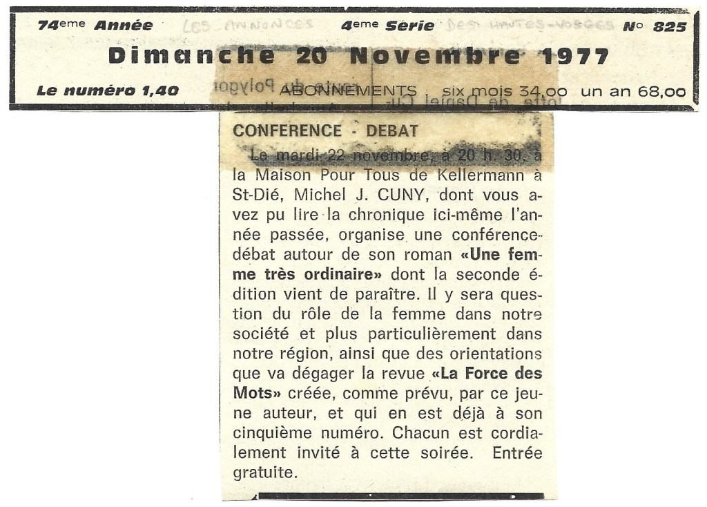 11. Conférence-Débat de Michel J. Cuny Publié le 12 avril 202112 avril 2021 par Cuny Petitdemange Les Annonces des Hautes-Vosges, 88 Fraize, Dimanche 20 Novembre 1977 12. Spectacles – Conférence à la M.P.T… Partager : Partager sur X(ouvre dans une nouvelle fenêtre) X Partager sur Facebook(ouvre dans une nouvelle fenêtre) Facebook J’aime chargement…