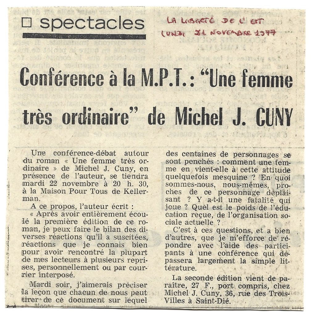 12. Spectacles – Conférence à la M.P.T… Publié le 12 avril 202116 avril 2021 par Cuny Petitdemange La Liberté de L’Est, 88 Saint-Dié, Lundi 21 Novembre 1977 13. Conférence-Débat autour du roman… Partager : Partager sur X(ouvre dans une nouvelle fenêtre) X Partager sur Facebook(ouvre dans une nouvelle fenêtre) Facebook J’aime chargement…