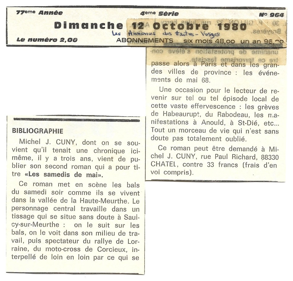 28. Bibliographie – Michel J. Cuny… Publié le 19 avril 202119 avril 2021 par Cuny Petitdemange Les Annonces des Hautes-Vosges, 88 Fraize, Dimanche 12 Octobre 1980 29. “Le dernier chemin” – Françoise Petitdemange Partager : Partager sur X(ouvre dans une nouvelle fenêtre) X Partager sur Facebook(ouvre dans une nouvelle fenêtre) Facebook J’aime chargement…