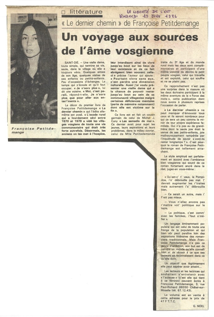 30. Littérature – « Le dernier chemin » de Françoise Petitdemange – Un voyage aux sources de l’âme vosgienne Publié le 19 avril 202120 avril 2021 par Cuny Petitdemange La Liberté de L’Est, 88 Saint-Dié, Vendredi 19 Juin 1981 31. Le jardin des piqûres – Le dernier chemin Partager : Partager sur X(ouvre dans une nouvelle fenêtre) X Partager sur Facebook(ouvre dans une nouvelle fenêtre) Facebook J’aime chargement…