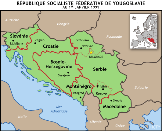 La Yougoslavie était désormais une fédération de 6 Républiques : au nord du pays, la Slovénie ; en dessous la Croatie ; au centre du pays et côte à côte : la Bosnie-Herzégovine et la Serbie composée au nord de la province de Voïvodine, et au sud de la province du Kosovo ; au sud de la Bosnie-Herzégovine : le Monténégro ; au sud du pays : la Macédoine.