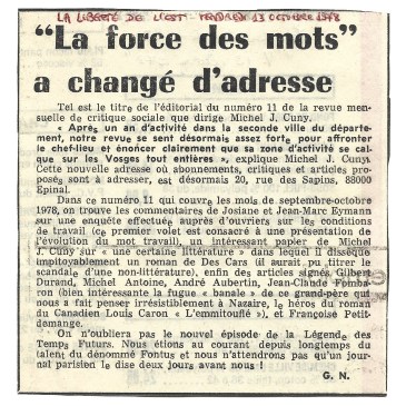 Lors d’un appel téléphonique à l’imprimerie d’Épinal, je n’hésitai pas à insister sur le travail satisfaisant de l’impression de notre livre Le Feu sous Cendre [Michel J. Cuny – Françoise Petitdemange, Éditions Cuny-Petitdemange, 1986, 660 pages, ouvrage plusieurs fois réédité], tout en précisant le fait qu’il nous était impossible de proposer aux lecteurs et lectrices les … Lire la suite 10. La force de vivre